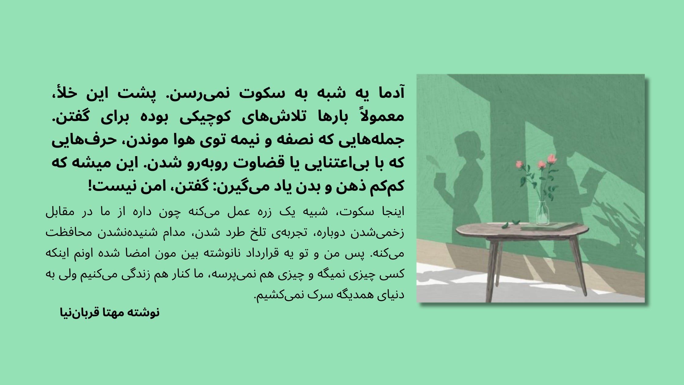 ولی آدما یه شبه به این سکوت نمیرسن. پشت این خلأ، معمولاً بارها تلاشهای کوچیکی بوده برای گفتن. جملههایی که نصفه و نیمه توی هوا رها شدن، حرفهایی که با بیاعتنایی یا قضاوت روبهرو شدن. این میشه که کمکم ذهن و بدن یاد میگیرن: گفتن، امن نیست! و اینجا سکوت، شبیه یک زره عمل میکنه چون داره از ما در مقابل زخمیشدن دوباره، تجربهی تلخ طرد شدن و مدام شنیدهنشدن محافظت میکنه. تو میدونِ حرف زدن انگار خطر پررنگ تره، خطر بزرگ تر شدن دعوا و شنیدن حرفایی که تحملشون سخته، خطر مواجه شدن با حقایقی که شاید ما رو شوکه کنه، شاید چیزهایی رو برامون یادآوری کنه که آرامش و خواب و خوراک رو ازمون بگیره و هزار ریسک و خطر دیگه. پس من و تو یه قرارداد نانوشته بین مون امضا شده اونم اینکه کسی چیزی نمیگه و چیزی هم نمیپرسه، ما کنارهم زندگی میکنیم ولی به دنیای همدیگه سرک نمیکشیم. ممکنه تو یک متری هم بشینیم ولی بینمون کیلومترها فاصلهست و کم کم رابطه ما به دو اتاق جداگانه تبدیل میشه.