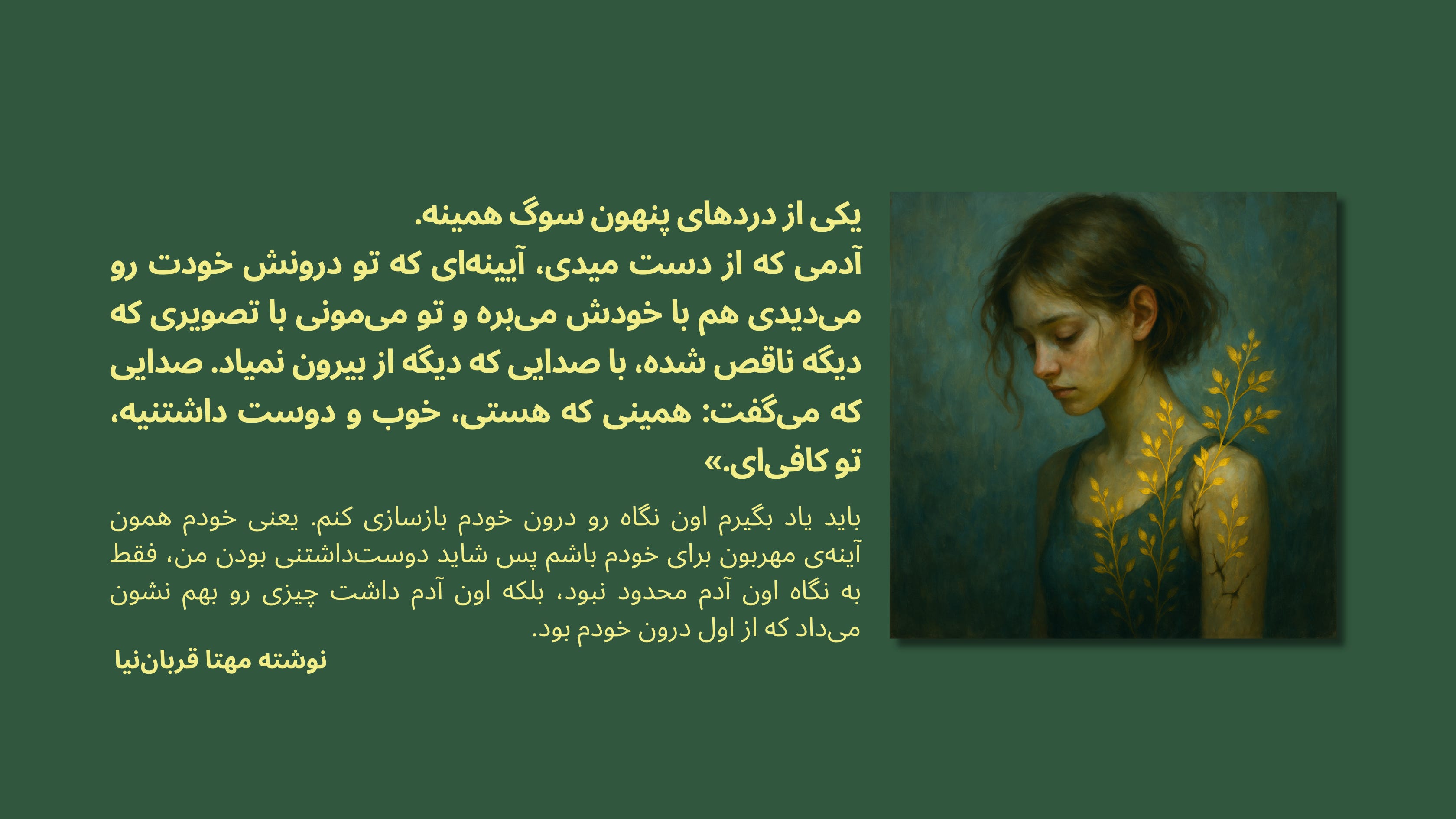 سوگ، بازسازی تصویری که از خودت داری با یه مصالح جدیده، وقتی آینهی بیرونی شکسته، حالا باید قطعات تازهای از محبت و پذیرش رو درون خودت بسازی. شاید با تمرین صداهای جدیدی که بهجای سرزنش، آروم بگن: «میفهمم، حق داری. تو هنوز هم دوستداشتنی هستی.»