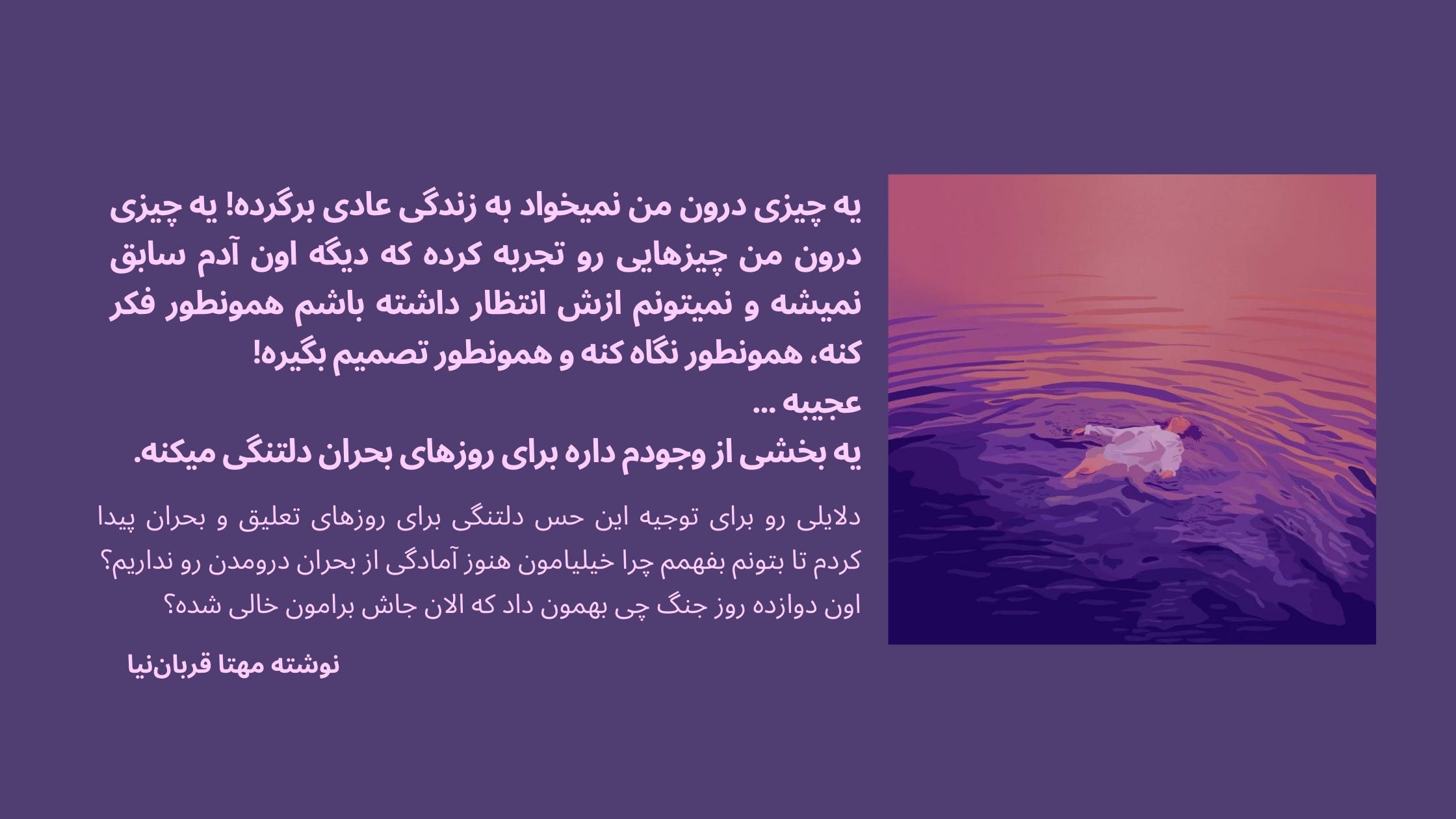 به جای "برگشتن" به همون ریتم و ساختار قبلی سعی کن "بازسازی" کنی، اسمگذاری کن برای نسخهی جدیدت. حتی شده توی یک جمله بنویس: «الان من مهتای…» مثلاً: «من مهتایِ کُندتر، بدبینتر و منزویتریام.» این جمله کمک میکنه از فشار "چرا مثل قبل نیستم؟" کم بشه.