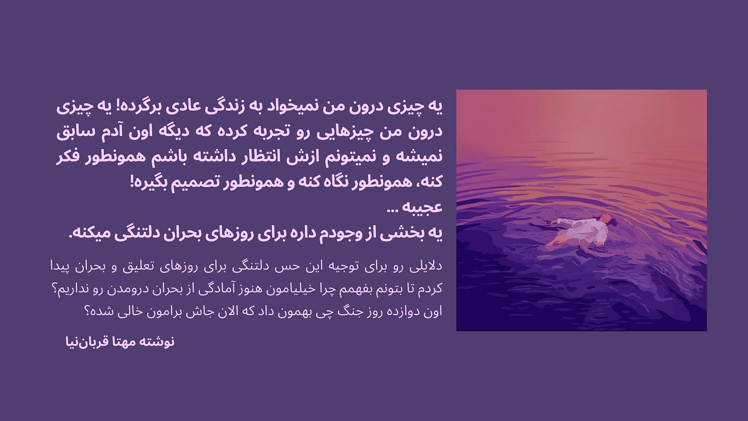 زندگی کردن در سرزمین بدون قضاوت. اونجا آدمها بابت تصمیماتشون کمتر قضاوت میشن. تو رفتی ترکیه؟ تو هنوز تهران موندی؟ تو گریه کردی؟ تو قوی بودی؟ همهی اینها تو بحران عادیتره، قابلفهمتره. ولی وقتی وضعیت نرمال میشه، قضاوتها برمیگردن. بنابراین دلمون برای "بودن" بدون نقد شدن بابت کوچیک ترین انتخاب هامون تنگ میشه.