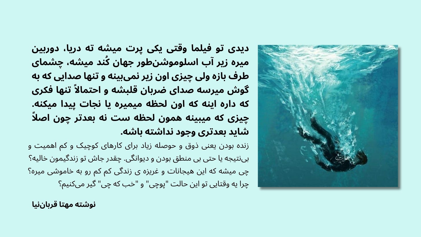 دیدی تو فیلما وقتی یکی پرت میشه ته دریا، دوربین میره زیر آب اسلوموشنطور جهان کُند میشه، چشمای طرف بازه ولی چیزی اون زیر نمیبینه و تنها صدایی که به گوش میرسه صدای ضربان قلبشه و احتمالاً تنها فکری که داره اینه که اون لحظه میمیره یا نجات پیدا میکنه. چیزی که میبینه همون لحظه ست نه بعدتر چون اصلاً شاید بعدتری وجود نداشته باشه. فقط روی بقا تمرکز میکنه. اونجا زیر آب اینکه الان بدنش چقدر رو فرم و فیته، اینکه آرایشگاه رفته یا موهاش بهم ریخته ست، اینکه مدل ماشینش چیه یا خونه ش چند متره، اینکه تاحالا اروپا رو دیده یا نه، اینکه چند بار مقام آورده یا مثلاً توی یه مسابقه یا رقابتی اول شده، اینکه دوستاش یا آدمها درموردش چه فکری میکنن اصلاًااا براش موضوعیت نداره… فقط زنده موندن و ادامه دادن مهم میشه!